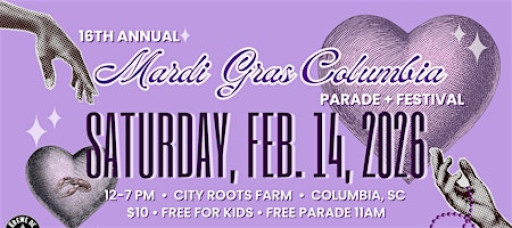 Mark your calendar — the 16th Annual Mardi Gras Columbia Parade & Festival is going down at City Roots urban farm on Saturday, February 14, 2026 in Columbia, SC! ⚜️