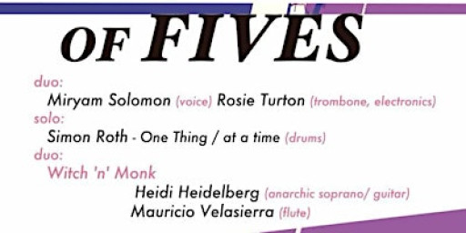 George Nelson's A Handful of Fives riffs of the five-musician format of his All Party Parliamentary winning Moment's Notice, only this time in established combos/solos and in any feasible configuration of five ( a trio and two solos, a quartet and a solo, a trio and a duo etc). So, hypothetically you might get Run The Jewels with The Carpenters and Matana Roberts (duo, duo, solo). Last year we had An Alien Called Harmony (trio) Kadialy (solo) Saied Silbak (solo).
