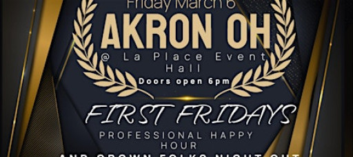 Welcome to Akron's First Friday Professional Happy Hour and Grown Folks Night Out! Join us at LaPlace Events on March 6, 2026 at 6:00 PM for a night of Grown fun and networking. This event is the perfect opportunity to unwind after a long work week. Join Akron's own hostess Ms. Roni J with celebrity guest host Comedian Mike Bonner. Great music will be spun by DJ EZ Money and Melrose Eve with Hera's Smooth Band will bring a performance you won't want to miss! Get there early for the complimentary hors d'oeuvres and other promotional giveaways while they last . Don't miss out on the chance to connect with other Grown Folks in a relaxed atmosphere. See you there!