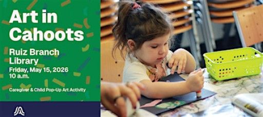 Art in Cahoots is a free one-hour event designed for prekindergarten-age students with an accompanying adult caregiver. Each will include sensory, multi-disciplinary, process-based arts activities for children and caregivers to experience together. Children can build social-emotional skills, familiarize themselves with a classroom setting, and learn while still under the wing of a trusted caregiver.