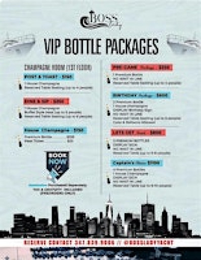IF YOUR CELEBRATING A SPECIAL OCCASION OR JUST LOOKING FOR A VIP EXPERIENCE. PURCHASE A VIP TICKET AND SHOW IT AT THE VIP LINE UPON ARRIVAL TO THE PIER 36 AT THE BOSS LADY MEGA 3 FLOOR YACHT. A SERVER WILL BRING YOU TO THE DESIRED TABLE AND YOUR DEPOSIT WILL BE TAKEN OFF THE ORGINGAL BOTTLE OR PACKAGE PRICE.