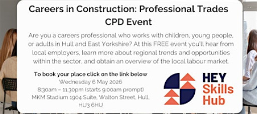 Hull & East Yorkshire Skills Hub welcomes local careers leaders and IAG practitioners to the Careers in Construction: Professional Trades event! Join us at the MKM Stadium 1904 Suite for a morning filled with information about the diverse career opportunities in this important sector. The event is FREE. Places are limited and bookable on a first-come-first-served basis. Please note, the event is for careers advice and guidance practitioners only and is not relevent to members of the general public.