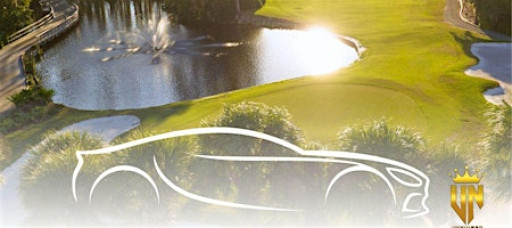 An exclusive golf course car show featuring exotic, luxury, and classic cars — parked directly on a championship signature hole fairway.