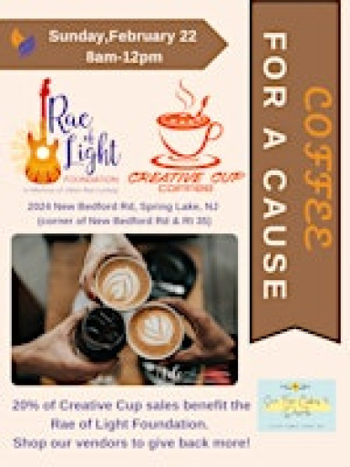 Join us in person for Coffee for a Cause –20% of Creative Cup sales benefit the Rae of Light Foundation. Shop our vendors to give back more!