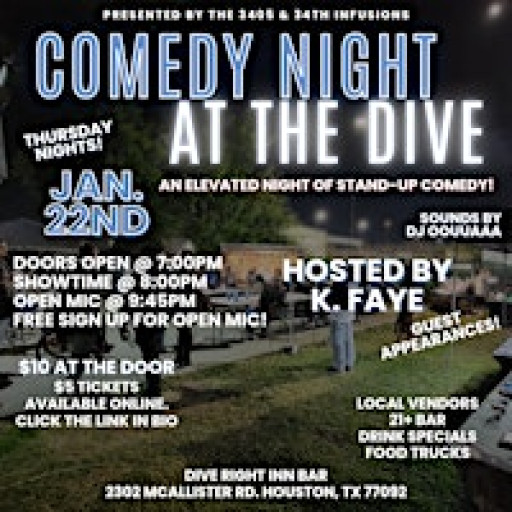COME KICK OFF THE NEW YEAR AT COMEDY NIGHT AT THE DIVE! JANUARY 22ND. DOORS OPEN AT 7PM. SHOWTIME STARTS AT 8PM. OPEN MIC AT 9:45PM.