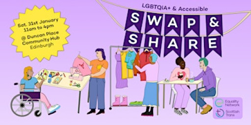 Welcome to Equality Network's first Community Exchange. Join us for an accessible LGBTI+ community swap and share at Duncan Place Community Hub in Edinburgh on Saturday 31st January from 11am to 4pm.