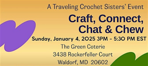 Come join "Craft, Connect, Chat & Chew", A Traveling Crochet Sisters' Event, hosted by Nicole, of Nias Comfort Zone, at The Green Coterie for a fun-filled day of crocheting, connecting, chatting, and chewing!