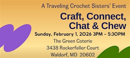Come join "Craft, Connect, Chat & Chew", A Traveling Crochet Sisters' Event, hosted by Nicole, of Nias Comfort Zone, at The Green Coterie for a fun-filled day of crocheting, connecting, chatting, and chewing!