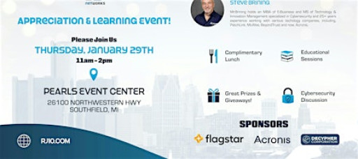 Join us on January 29th from 11 AM–2 PM at Pearls Event Center for the RJ Networks Appreciation and Learning Event. Enjoy lunch, giveaways, and valuable cybersecurity awareness discussions while connecting with our team and local organizations. Register today to reserve your spot!