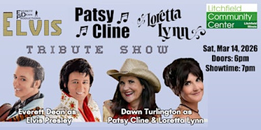 Welcome to Elvis Presley, Patsy Cline, and Loretta Lynn live tribute concert at the Litchfield Community Center in Litchfield, IL! Get ready to see an ultimate tribute show to three music icons on Saturday, March 14, 2026 at 7:00 PM (Central Time). It's going to be an epic night of classic tunes with a tribute to music's biggest acts both in country and rock n' roll! Don't miss this incredible concert that will transport you back in time to the golden era of music. Get your tickets now!!!