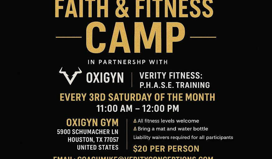 Come join us for a day filled with sweat, faith, and fun with Verity Fitness! Get ready to challenge yourself and connect with others every third Saturday at 11 AM (Central Time). This event is all about pushing your limits physically and spiritually while building a strong community. Don't miss out on this opportunity to grow in both body and soul!