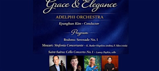 Grace & Elegance: Adelphi Orchestra with featured soloists in works by Saint-Saëns, Mozart & Brahms.