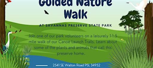 Join one of our volunteers on an informal, easy going walk to orient you to the trails and introduce you to some of the plants and animals that can be found at Savannas Preserve State Park. Ideal for newcomers and beginners who would like company when exploring the outdoors with someone who is familiar with the terrain.