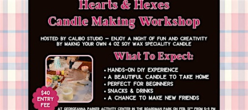 Join us in person for a magical night at the Hearts & Hexes Candle Making Workshop! Held at the Georgeanna Parker Activity Center at The Boardman Park, this workshop will teach you how to create your own 4 oz soy wax candle! With available add-ons such as wax hearts and metal alphabet beads, these DIY candles are perfect for setting the mood or gifting to someone special. Whether you're a beginner or a candle connoisseur, this fun, hands-on experience will light up your creativity. Bring your sweet vibes and leave with a romantic creation you'll love!