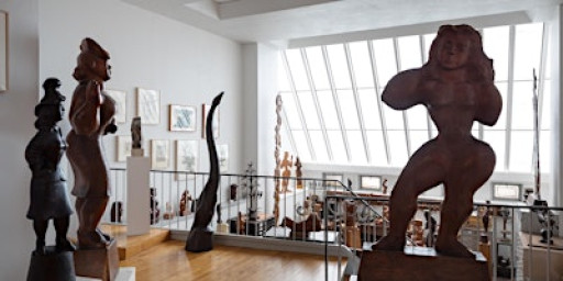 The House & Studio Tour explores three floors of the Renee & Chaim Gross Foundation's historic LaGuardia Place building, including Gross's first-floor sculpture studio and gallery, renovated in 1963 by the artist and later restored in 2017-18, as well as the Foundation's special exhibition space on the second floor. The third floor houses the Grosses' living and dining space featuring hundreds of works from their extensive private art collection, including important American paintings by Marsden Hartley, Willem De Kooning, Milton Avery, Jacob Lawrence, and others, installed by the artist with his African, Pre-Columbian, Oceanic, and decorative arts and preserved as it was installed during Gross's lifetime.