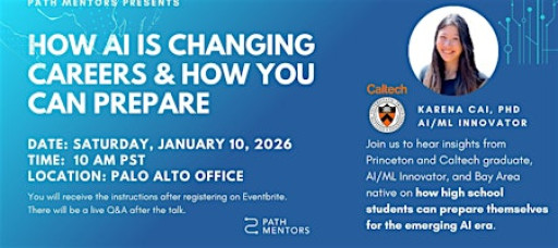 This in-person event is perfect for students curious about careers in AI, technology, or trying to figure out what to do that can be AI-proof. Join us for an exclusive talk with Karena Cai, PhD, Princeton & Caltech graduate, AI/ML innovator, and Bay Area native, on how high school students can prepare for the rapidly evolving AI era.