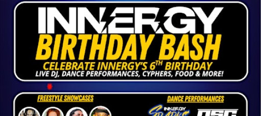 The INNERGY Birthday Bash is a high-energy, 2.5-hour celebration bringing together studio families, dancers, and the local street dance community under one roof. Powered by a live DJ, the night will feature dance performances, freestyle showcases, and an open dance cypher highlighting the raw creativity and culture of street dance.