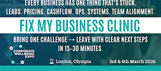 You’re invited to Fix my Business Clinic at Corporate Wellbeing Expo (London Olympia, 3–4 March 2026) — built for visitors who want outcomes, not overwhelm.
