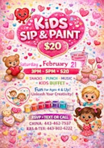 Kids Valentine’s Sip & Paint \nA sweet and creative Valentine’s experience just for the kids!\nJoin us for an evening full of painting
