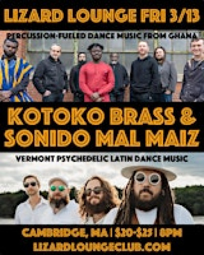 Inspired by the traditional drum rhythms of Ghana, Kotoko Brass has created a unique, joyful, and improvisational style of West African dance music described by the Boston Globe as “propulsive, infectious party music”. The drums provide the heart and soul of Kotoko Brass — merging syncopated African percussion polyrhythms with hard-hitting dance grooves on the drumset. The horns blend traditional sounds of New Orleans with the famous West African brass band sound heard from Ghana to Nigeria, and the guitar, keys, and bass evoke classic African and Caribbean styles of highlife, afrobeat, and reggae. A celebratory and energetic synthesis of music, people, and cultures from around the world, Kotoko Brass features musicians from Ghana, Antigua, Japan, and the United States playing together in unity. In the US, Kotoko Brass has shared the stage with Angelique Kidjo, Femi Kuti, and Vieux Farka Toure, and on their debut tour of Ghana in 2023, they had the honor of performing for Ashanti King Nana Osei Tutu II.