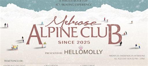 Step into Melrose Alpine Club: Presented by Hello Molly, where skyline views, snowy vibes, and seasonal cocktails meet. Skate under the sun or stars and soak in the ultimate rooftop winter experience.
