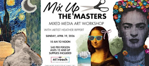 Mix Up the Masters is a hands-on mixed media workshop led by artist Heather Rippert that invites you to break the rules and reimagine art history. Participants will cut, layer, and remix iconic imagery to create bold, original works of art. All levels welcome! Bring your curiosity and a willingness to experiment. All supplies included.