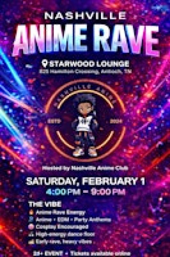 Join us in person for an epic night celebrating all things anime! Dive into a world of colorful cosplay, awesome music, and great vibes. Whether you're a hardcore fan or just looking to have fun, Nashville ANIME RAVE is the place to be. Bring your friends and let's rave the night away with killer beats and anime fandom all around!