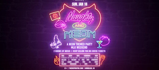 The District Is open Sunday Jan 19th, Monday is a Holiday! Party from 10pm til 4am. Two rooms of music. Neon themed attire suggested but not required.