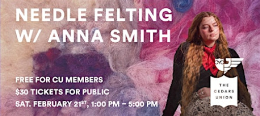 Join Anna Smith at The Cedars Union for a hands-on needle felting workshop. Following a brief presentation, Anna will cover the basics of creating your own small, fuzzy, soft sculptures using tufted wool. All materials provided!
