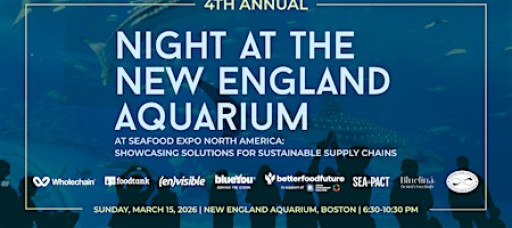 Food Tank, Wholechain, Envisible, BlueYou, Bluefina, Pesca Con Futuro, SeaPact ,and Better Food Future in support of the UN Global Compact Ocean Stewardship Coalition are excited to present an extraordinary evening Sunday, March 15th, 2026 at the New England Aquarium during Seafood Expo North America.