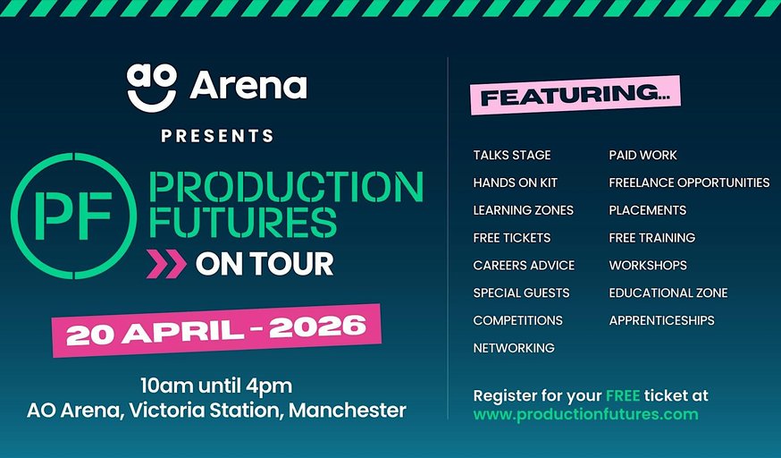 Join us on Monday 20 April 2026, at Production Futures ON TOUR, the ultimate careers event for young people passionate about production. Whether you're interested in live events, music, touring, theatre, TV, broadcast, or film, this is your chance to learn, train, network, and develop your career in one of the most exciting industries in the world!