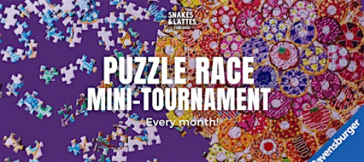 Compete for prizes! Come and try to win the puzzle contest with your friends! Join us twice a month from 12PM to 2PM at Snakes & Lattes Chicago for a fun Puzzle Race in collaboration with Ravensburger!