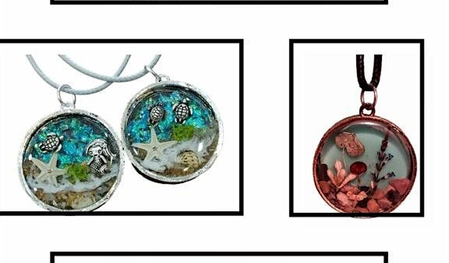 Come join us for a fun and creative **jewelry-making** experience in this in-person workshop led by the talented Janie! In this class, you'll learn how to create THREE beautiful **open bezel** pendants (for just $45), using various techniques and materials such as dried flowers, coastal charms, sand, etc. You will select from silver or goldtone bezels, as well as a colored cord to complement your pendant.