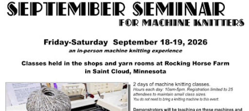 SEPTEMBER SEMINAR for Machine Knitters & Fiber Artists\nSept. 18-19, 2026\n10-5 each day\nClasses, sales, round table discussions, contest