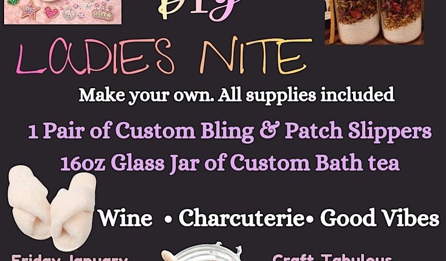 ✨🎀 Soft Girl Era: DIY Ladies Nite 🎀✨\nIt’s giving soft, cozy, creative & self-care 💅🏽🕯️\nGrab your girls and step into your Soft Girl Era for a night of intentional relaxation and crafting.\n💖 What you’ll create:\n• 1 pair of custom bling & patch slippers\n ✨ Choose from a variety of patches and bling to design the cutest, softest pair of cozy slippers\n• A 16oz glass jar of custom bath tea\n 🌸 Curated with a high-quality selection of essential oils, fragrance oils, and dried flowers to fit your personal relaxation needs\n🍷 Wine • Charcuterie • Good Vibes\n👚 Come dressed in your soft girl pajamas or lounge wear\n📅 Friday, January 16, 2026\n⏰ 6PM – 9PM\n💲 $55 per person\n📍 Craft-Tabulous Craft Studio\n1100 Reisterstown Road, Suite 106\nPikesville, MD 21208\n✨ All supplies included — just bring your softest energy 💕\n🎟️ Spots are limited... Click the link to grab your spot Crafttabulousuniversity.bigcartel.com \n#SoftGirlEra\n#LadiesNiteVibes\n#CraftTabulous\n#SoftLife\n#DIYRelaxation\n#SelfCareNight\n#GirlsNightIn\n#PajamaPartyVibes