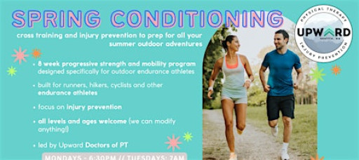 This program is led by the Docs of PT at Upward, with combined years of experience participating in, rehabbing and coaching athletes of all levels. History of injuries or just getting back into regular workouts? No problem! Our unique skill set as PTs will help you modify any part of the workouts as needed. We're also experts in creating challenging workouts using limited equipment that you'd typically have at home, in case you want to get that extra workout in during the week!