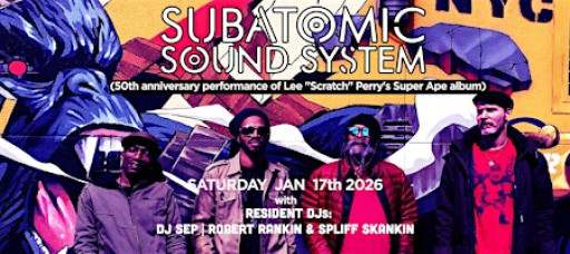 Subatomic Sound System + Screechy Dan(50th anniversary performance of Lee "Scratch" Perry's Super Ape album)Subatomic Sound System + Screechy Dan will stage a multimedia live performance of the 1976 dub masterpiece by their former band leader and mentor, Jamaican reggae inventor Lee "Scratch" Perry to celebrate the 50th anniversary of the album release. The show will incorporate never before heard audio and video of Scratch. In 2016, Lee "Scratch" Perry & Subatomic did a 40th anniversary tour complete with a giant custom built replica of the gorilla from the original album cover that was crowdfunded by fans. The success of the sold out tour led to the release of the "Super Ape Returns to Conquer" album based on the reimagined live versions of the songs. On the new recording, which turned out to be Scratch's highest charting ever Billboard release, Brooklyn via Trenchtown singjay legend Screechy Dan voiced many of the classic vocals from the original album while Scratch added all new vocals which will be heard and dubbed in this performance. Subatomic Sound System began performing with Lee "Scratch" Perry and continued as his steady band until he transitioned in 2021. Subatomic is spearheaded by producer, DJ, and multi-instrumentalist Emch,who arranges and manipulates both prerecorded music instruments and effects with the live musicians to create a real time musical dialogue. The core live musicians include Jamaican percussion legend and Black Ark veteran Larry McDonald (Peter Tosh, Skatalites, Gil Scot Heron) and Troy Shaka Simms (Brooklyn Gypsies, Mobius Collective) on sax and horn arrangements. In 2024 Subatomic Sound System released "Rockin' Like A Champion" with Grammy winning former Black Uhuru singer Mykal Rose and UK lover's rock queen Hollie Cook. BBC's David Rodigan described the music, which blends reggae with bass heavy sound system dub, as "absolutely brilliant." In the past decades, Subatomic has toured as live band, sound system, or selector across the USA, Canada, UK, Europe, Middle East, Russia, India, and Mexico including appearances at France's Telerama Dub Festival, The Marley’s Kayafest, Coachella, Hungary’s Ozora Festival, SoleDXB, Cali Roots, Cali Vibes, Hollywood Bowl and opening for US tours by Stephen Marley and Julian Marley.