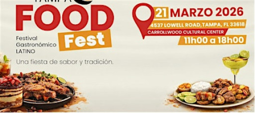 Tampa Food Fest | 21 de marzo | Centro Cultural Carrollwood. Sabores latinos, música en vivo y ambiente familiar.