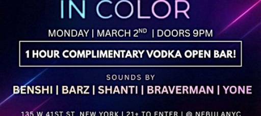 The Annual Purim In Color @ NEBULA NYC - Monday 3/2 (w/ 1H Vodka Open Bar!)