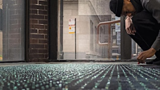 Over the duration of the exhibition, SCAM will produce A Love Letter, thousands of glass fragments laid by hand in an ordered, reflective field. At this event, production will come to an end, and the piece will be ultimately swept away.