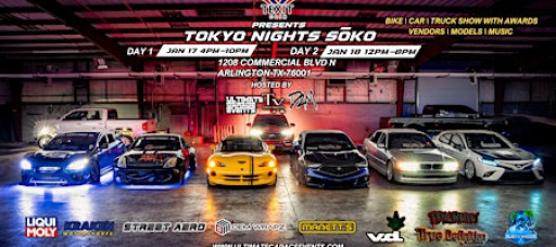 A vibrant nighttime warehouse car show inspired by Tokyo street culture. Modified JDM cars, lowered trucks, and custom builds are lined up under neon lighting and colorful LED accents. The scene glows with purple, blue, and pink lights, reflecting off polished paint and chrome wheels. Crowds gather around the vehicles, taking photos and socializing, while industrial walls and urban décor create an authentic underground Tokyo-night atmosphere. The energy is electric, showcasing style, horsepower, and creativity at the Tokyo Nights SOKO Show.