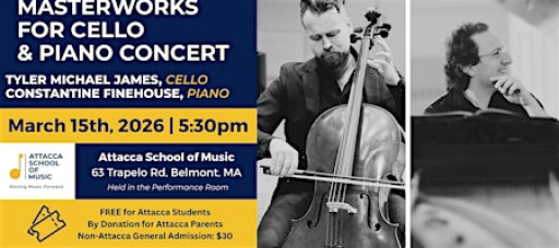 Attacca School of Music is proud to present an evening of world-class chamber music featuring pianist Constantine Finehouse and cellist Tyler Michael James.