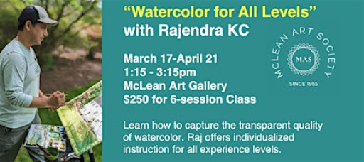 6 classes. Learn to capture the transparent quality of watercolor, including still life and landscapes. Individualized instruction accommodates students from beginners to the very experienced. Supply list provided to registered students. Classes are held at the McLean Art Gallery at the Chesterbrook Shopping Center on Tuesdays, 1:15 to 3:15 pm on March 17, 24, 31, and April 7, 14, 21.
