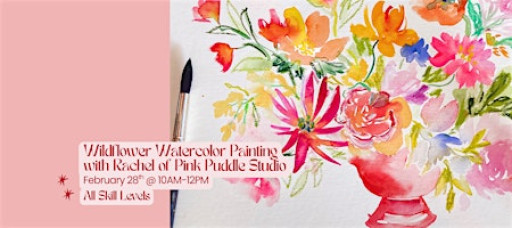 Join Rachel, of Pink Puddle Studio, on Saturday February 28, 2026 at 10am on the Botanica Patio at The Farm at South Mountain for a watercolor workshop! We will be painting whimsical wildflowers in a still life form but with looser brushstrokes and added texture with oil pastel. All skill levels are welcome!