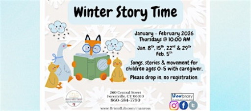 Songs, stories & movement for children ages 0-5 with caregiver. Please drop in, no registration. Winter Story Time dates: Jan. 8th, 15th, 22nd & 29th, Feb. 5th. Manross Library: #860-584-7790.