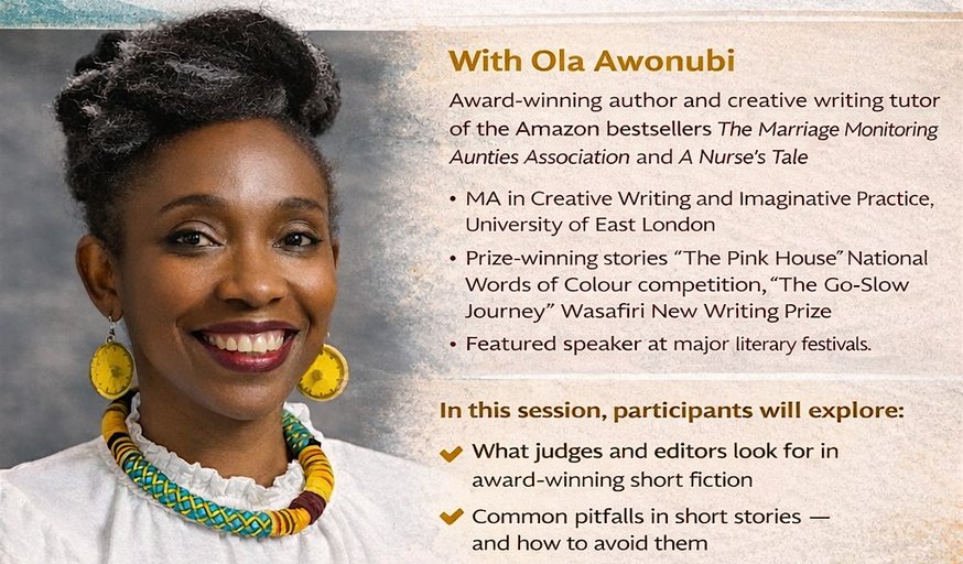 Join Ola Awonubi, award-winning author and creative writing tutor, for a focused and practical session on crafting short fiction that resonates. Ola is the author of the recent Amazon bestsellers The Marriage Monitoring Aunties Association and A Nurse’s Tale (One More Chapter Books, HarperCollins.